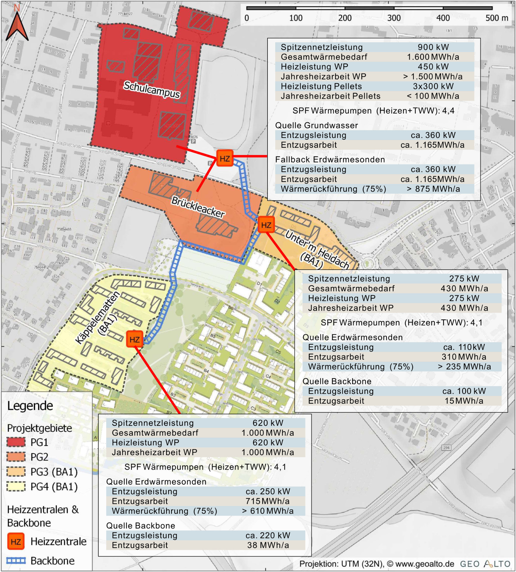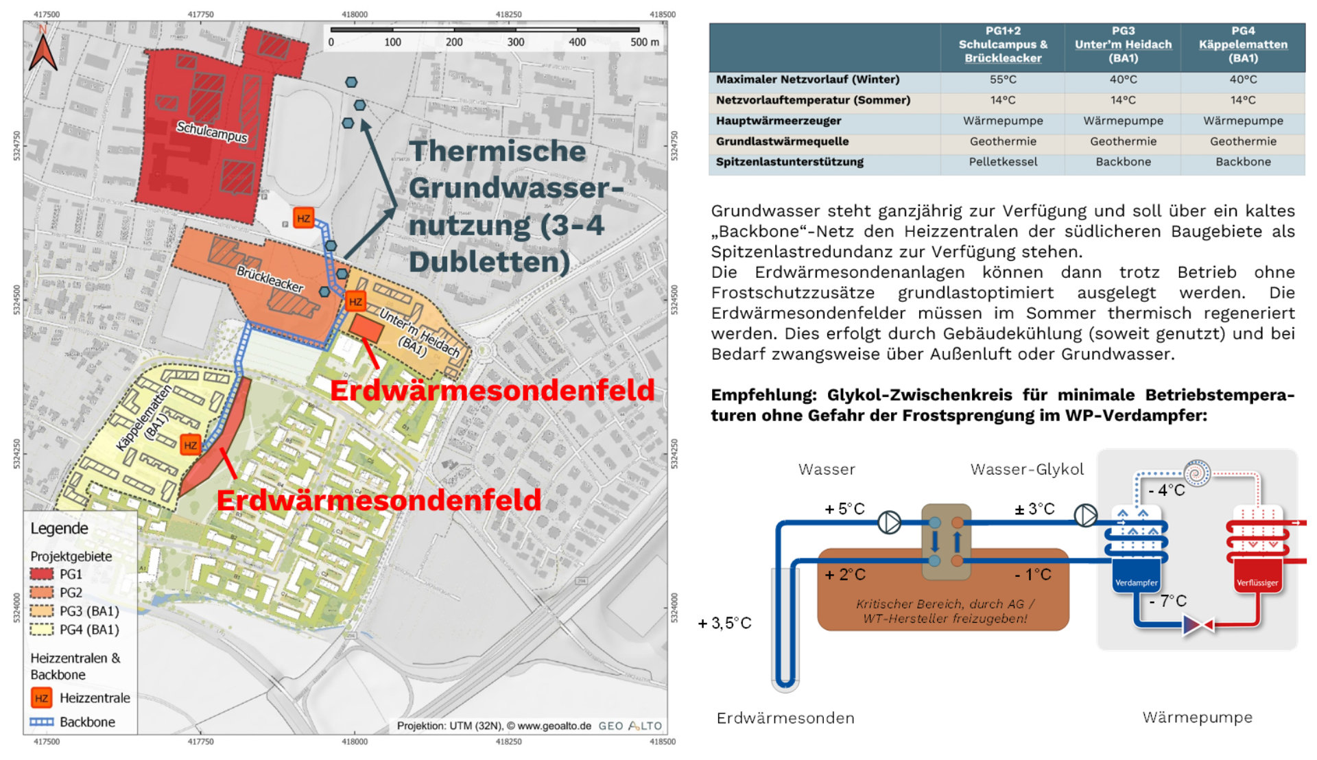 Die Grundwasserverfügbarkeit am Standort ist aufgrund der Nähe zur Hauptrandverwerfung des Rheingrabens lokal variabel. Da davon auszugehen ist, dass Grundwasser nicht in allen Projekt-Teilgebieten gleichermaßen zur Verfügung steht, wurde sowohl die thermische Nutzung des Grundwassers, als auch eine Erschließung mit Erdwärmesonden inklusive der Möglichkeit einer hybriden Nutzung untersucht. Verschiedene Wärmenetze mit jeweils eigenen zentralen Wärmepumpen (Netzvorlauf zwischen 40-55°C) versorgen dabei die einzelnen Projektgebiete. Ein kaltes Wärmenetz (hier „Backbone“ genannt) soll Grundwasserwärme in allen Teilgebieten verfügbar machen und zum Lastausgleich zwischen den einzelnen Heizzentralen beitragen.