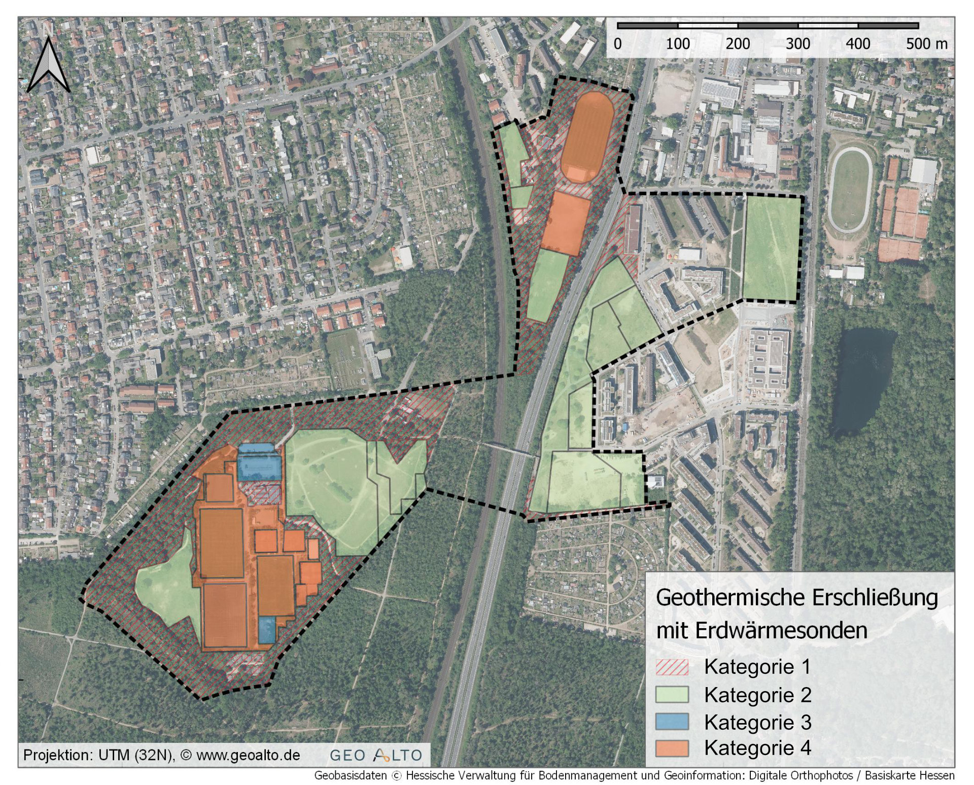 Die GeoAlto GmbH bewertete anhand vorgegebener potentieller Flächen im Umkreis bestehender Fernwärme-Heizkraftwerke zunächst deren Erschließungsattraktivität auf Grundlage der bestehenden Flächennutzung sowie der genehmigungsrechtlichen Randbedingungen. Aus der geologischen Untergrundbeschaffenheit wurden bezogen auf verschiedene Aggregatsbereiche sinnvoll erschließbare Bohrtiefen abgeleitet und das langfristig gewinnbare geothermische Potential anhand thermischer Simulationen abgeschätzt. Weiterführend wurden auch die zu erwartenden Erschließungskosten anhand der aktuellen Marktsituation (2022) bewertet.