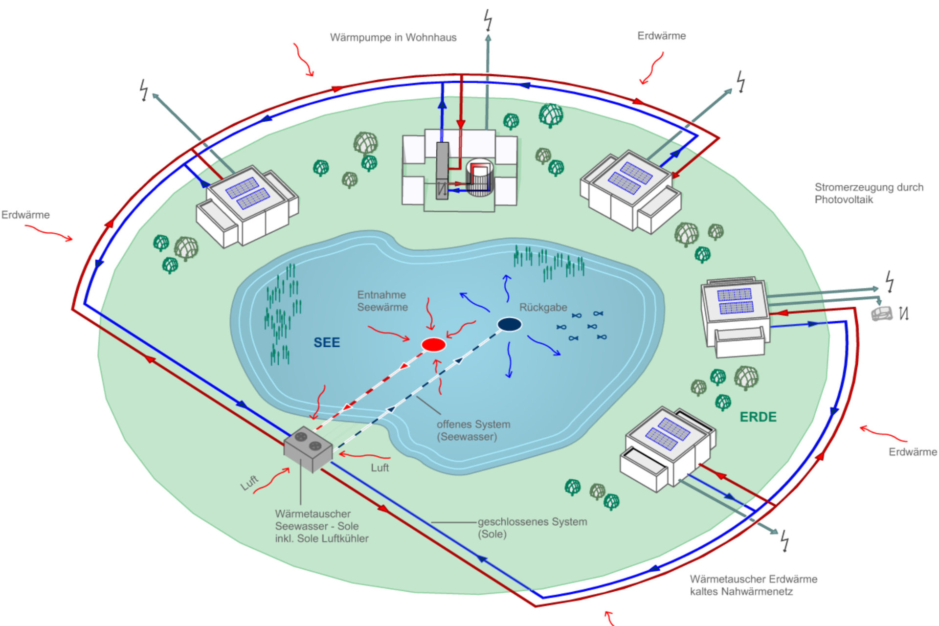 Zur thermischen Nutzung des Seewassers wird in einer Tiefe von voraussichtlich 4,5 bis 6 Meter Wasser entnommen und wieder eingeleitet. In der Technikzentrale wird das Seewasser über einen Trennwärmetauscher an das Nahwärmenetz gekoppelt. Das Nahwärmenetz selbst verbindet die dezentralen Verbraucher mit der Umweltwärme aus dem See und fungiert dabei selbst als Erdwärmekollektor, der einen Teil des Wärmebedarfes sowie einen Großteil des Kältebedarfes geothermisch decken kann. Das Gesamtpotential aus Umweltenergie liegt im Bereich von 160 kW bei jährlich bis zu 260 MWh Wärme und 18 MWh Kälte (Stand 2022).
