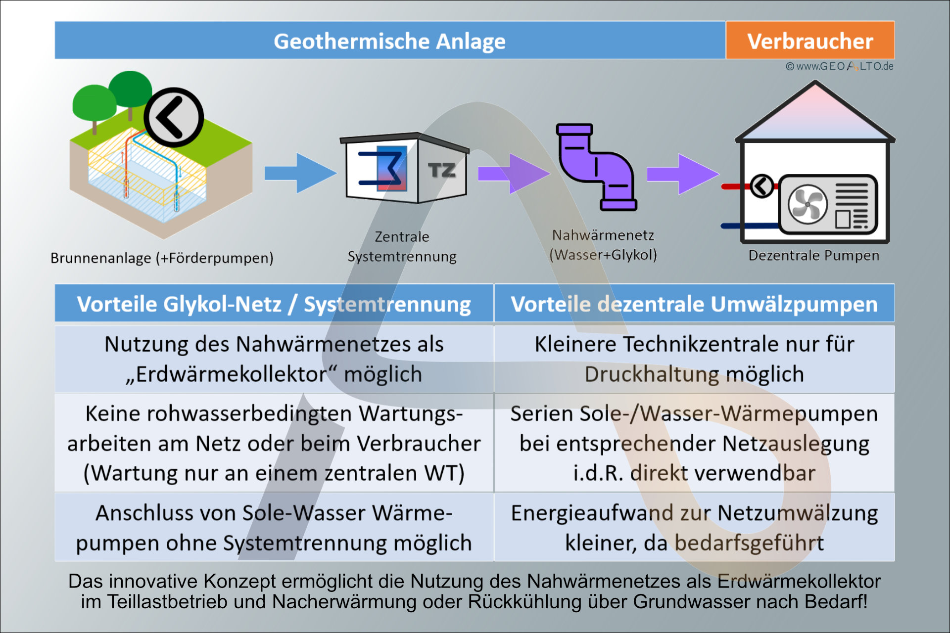 Eine thermische Brunnenanlage versorgt über ein kaltes Nahwärmenetz dezentrale Wärmepumpen mit Wärme und Kälte aus Grundwasser.