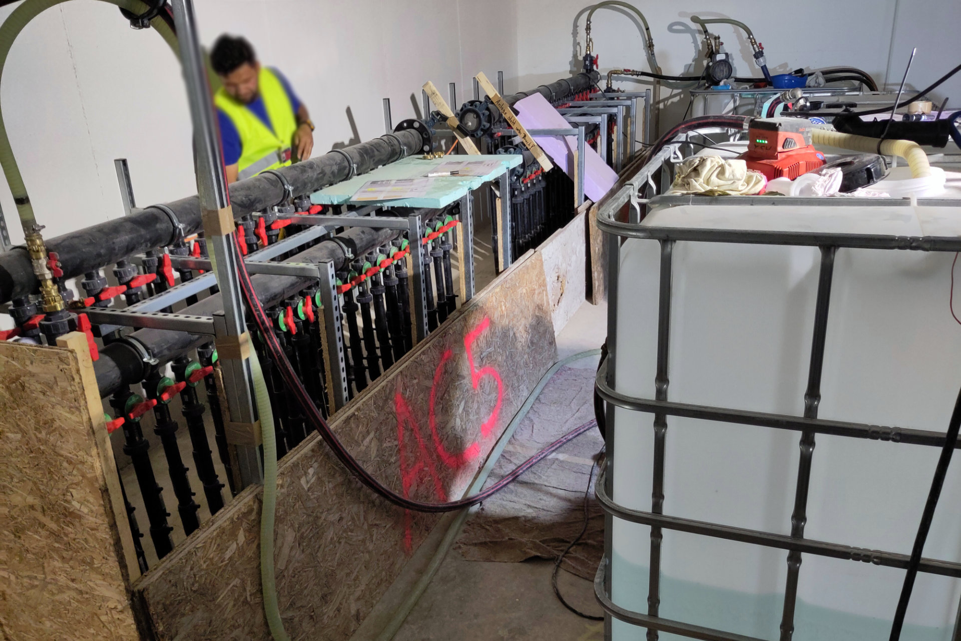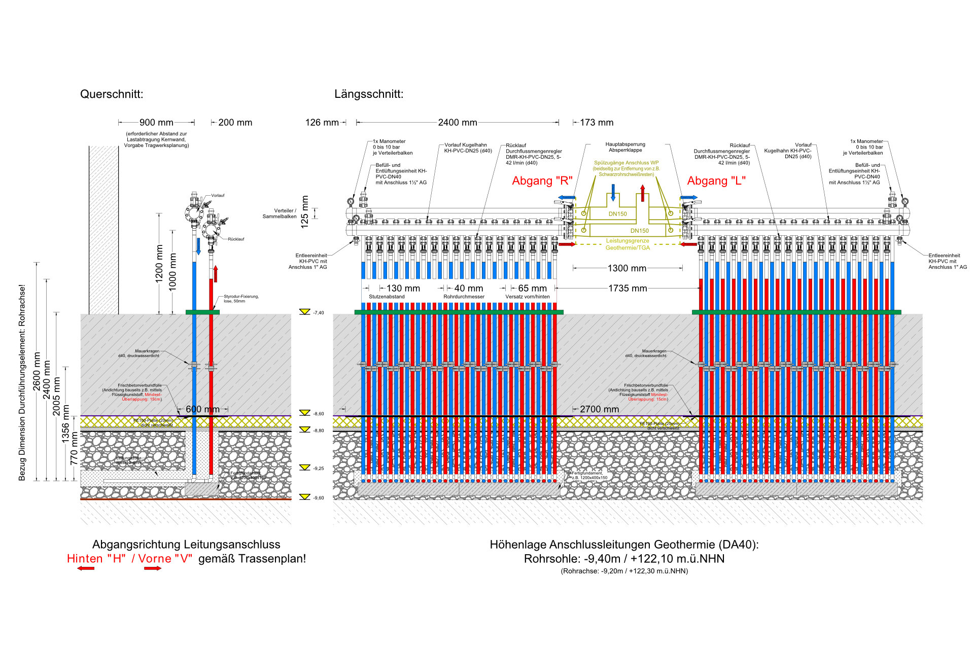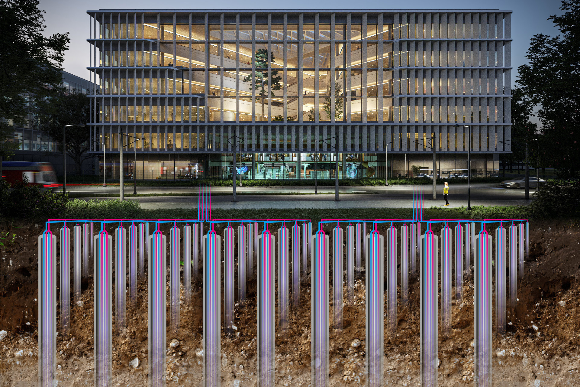 Zur Wärme- und Kälteversorgung des Gebäudes wurden insgesamt 149 Erdwärmesonden mit einer Tiefe von ca. 140 m unterhalb des Gebäudes errichtet. Die Bauausführung erfolgte in der mehr als 10 m tiefen Baugrube in enger Verzahnung mit den Gewerken Tiefbau und Rohbau. Der eng getaktete Terminplan und die Ausführung in den Wintermonaten 2023/2024 erforderten eine gründliche Vorbereitung und eine besonders intensive Begleitung der Arbeiten während der Ausführung. Mittels zeitlich hoch aufgelöster thermischer Simulationen wurde eine Verzahnung von Erdreich und Außenluft zum Heizen und Kühlen des komplexen Gebäudes im Gesamtkonzept realisiert.